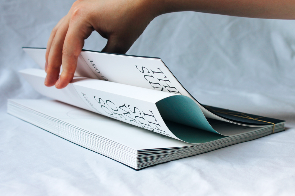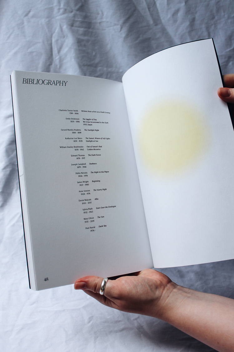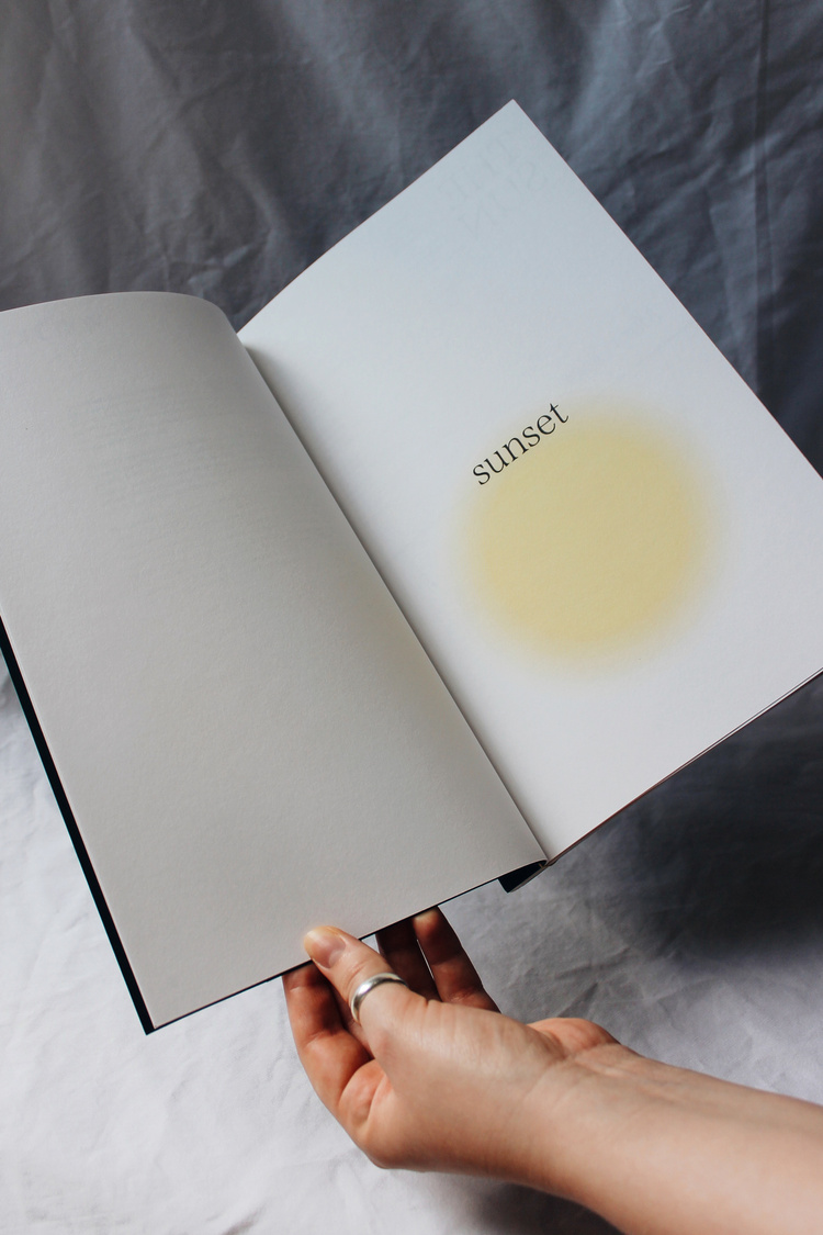 The spreads for the nineteen collected poems are structured around a central horizontal line representing the horizon by the line “Sky and sea, horizon-hinged” by Sylvia Plath. The passing of time and progression through the book is marked by the movement of the sun, symbolised by soft, hazy circles, as if a light spot on the page.