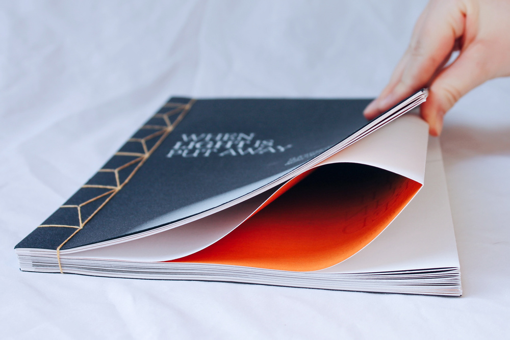 Process of hand cropping and binding the book. Gold-coloured thread was chosen to bind it as I felt it to be the most fitting to the publication's theme; a thread of light running through the book.